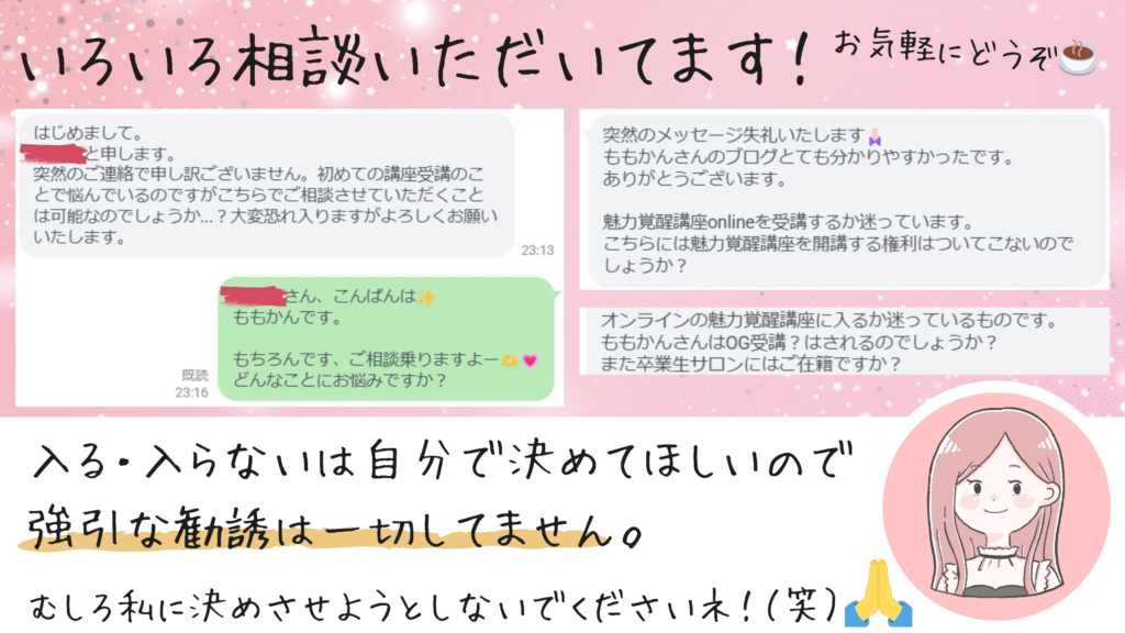 私は魅力覚醒講座20期を受講しましたが、入るときは「本当に大丈夫かな。これだけ大金払って、何も変わらなかったらどうしよう…」とめちゃくちゃ不安になりました。